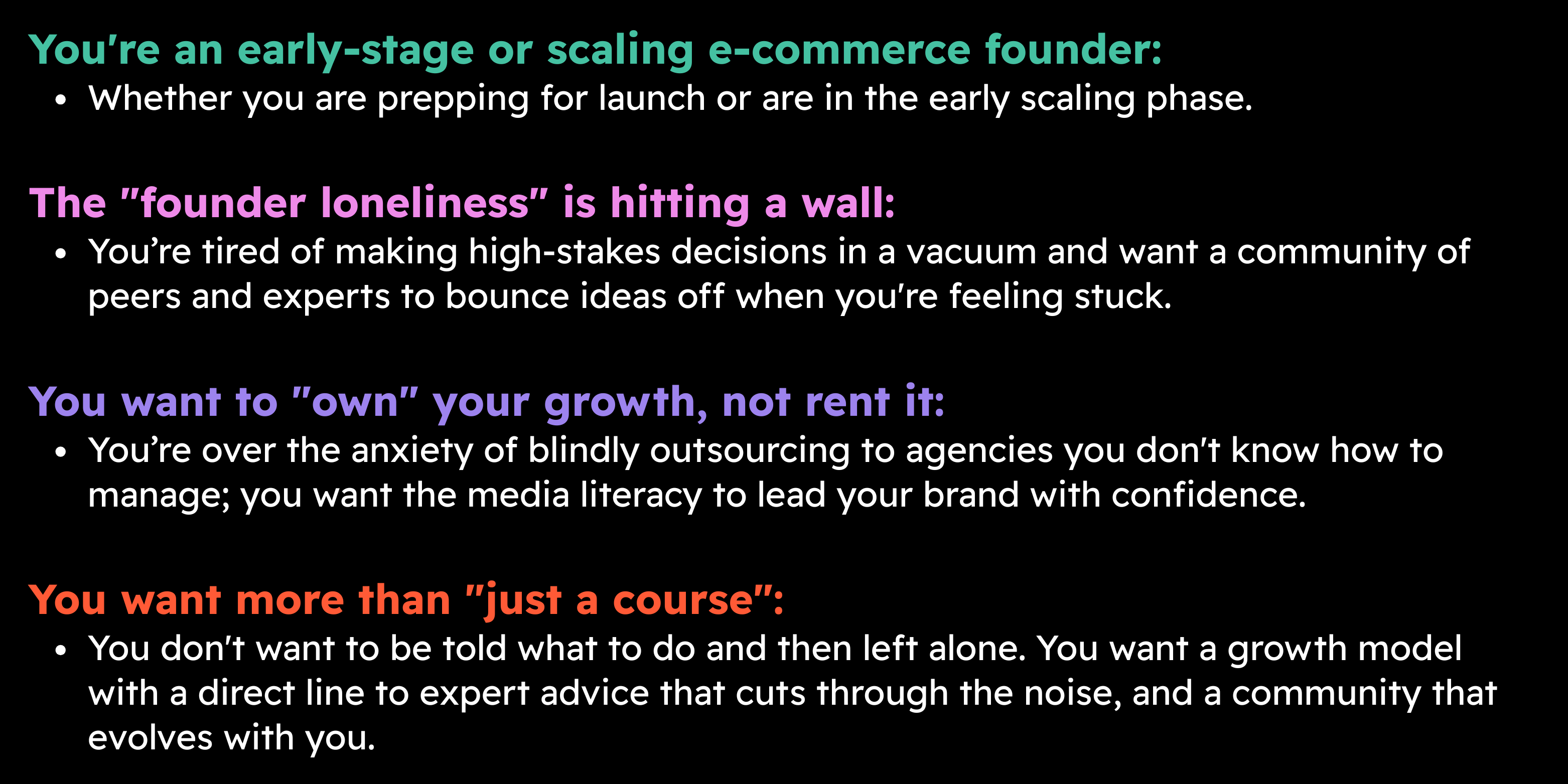 As a founder, you spend countless hours online trying to find the answers and information you need. Or you pay thousands (which you likely can't afford) - to big agencies or ecomm 'solutions'. This is the growth model and information shortcut I wish I had when I was starting out. All in one place, and for a fraction of the price of other options out there.