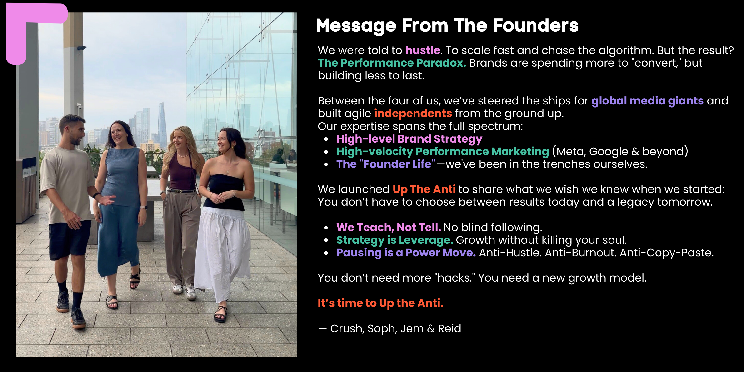 Building a brand like BEETL means balancing a million moving parts, and it’s easy to get lost in the noise. Up the Anti stops the temptation to fall into reactive 'hustle' to proactive strategy, giving us a clear, repeatable framework for growth. Having access to the unique combination of each of the founders experience is invaluable as part of the Anti community.